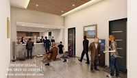 Preview Design Interior view dari pintu utama menuju counter dengan tampilan yang menarik di selasar termasuk plafondnya. Hasil design sudah direview dengan permintaan perubahan, Dinding ruang tamu dan pintu kaca disunblas, dibawah counter ada lampu indyright, tampilkan tv untuk iklan, pintu masuk ke ruang staff pintu panel.